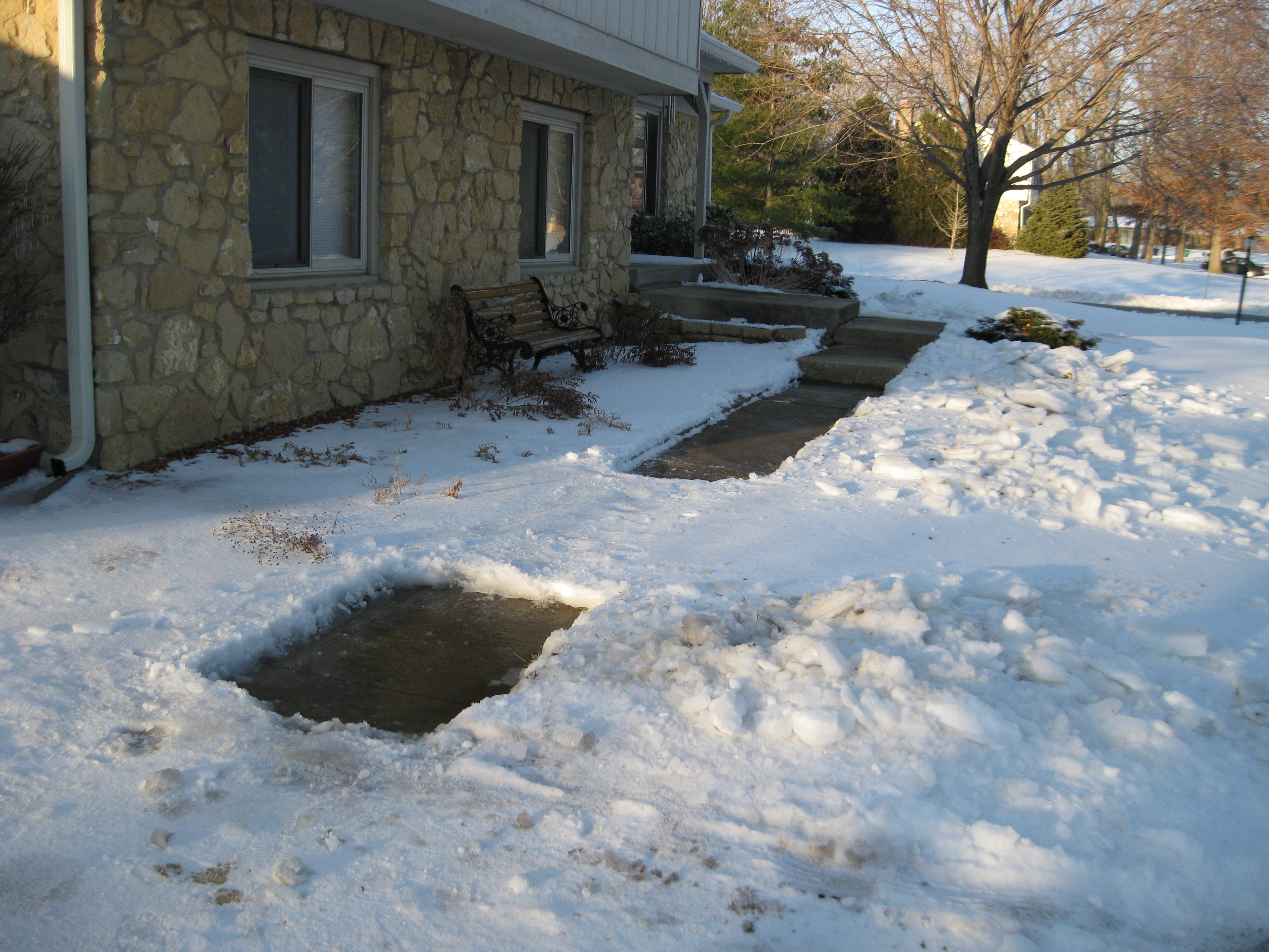 End of day one, and the ice won. I thought I would at least get the entire front walk done, but my back gave out around 4:00 p.m. The sun, not son, helped; the son had school. Unfortunately the solar heat melted ice on the roof, and the downspout is on the corner where the front walk begins, so the little space I cleared there filled with water and is now slicker than it was with the original ice. Maybe a spare floor mat would help keep people from slipping.